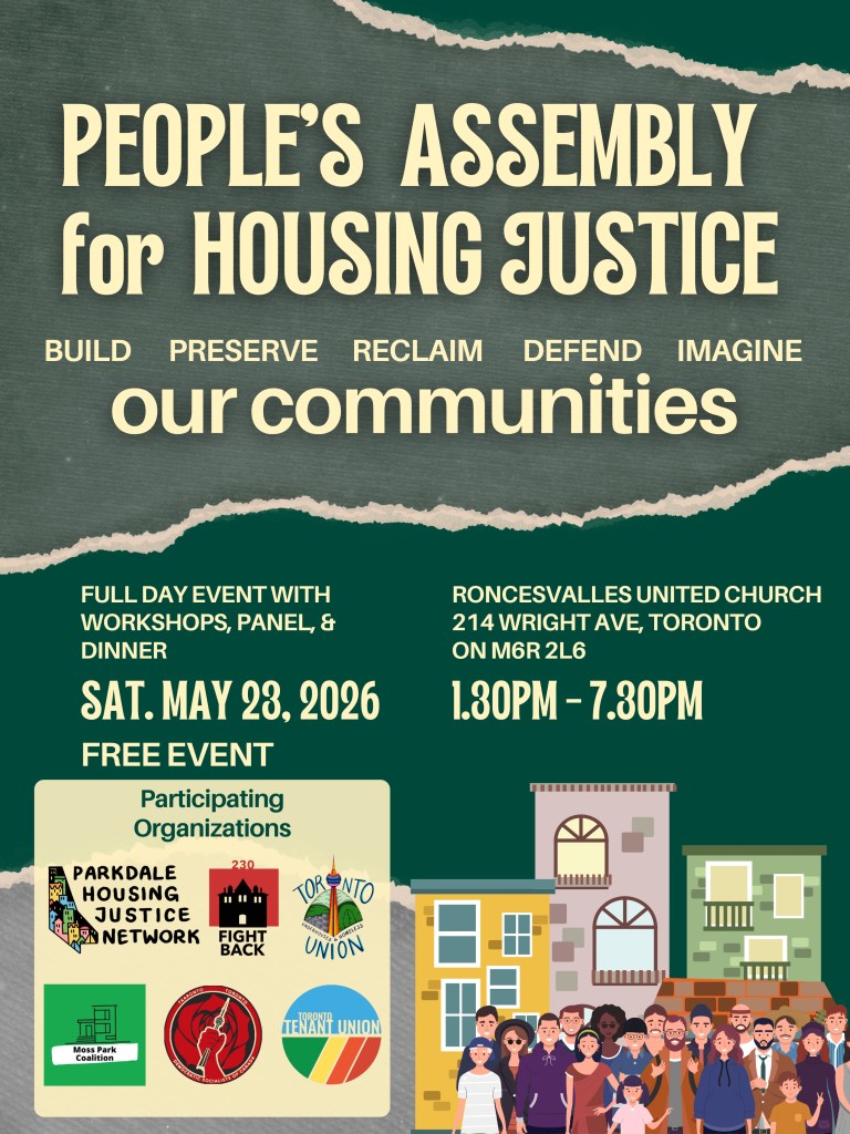 This year’s assembly is being planned by Parkdale Housing Justice Network, Toronto Underhoused and Homeless Union, Toronto Tenant Union (YSW & CJT), Democratic Socialists of Canada, Moss Park Coalition, and 230 Fightback.